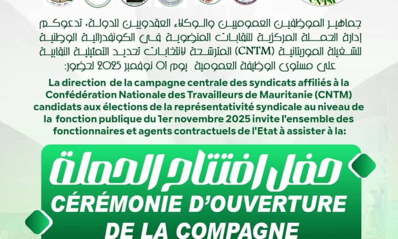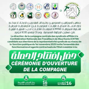 وفي هذا الإطار، دعت إدارة الحملة المركزية للنقابات المنضوية في الكونفدرالية جميع العمال والفاعلين النقابيين إلى حضور حفل الافتتاح الرسمي للحملة، المقرر يوم الخميس 16 أكتوبر 2025 عند الساعة الرابعة مساءً (16:00)، في دار الشباب القديمة بالعاصمة نواكشوط.