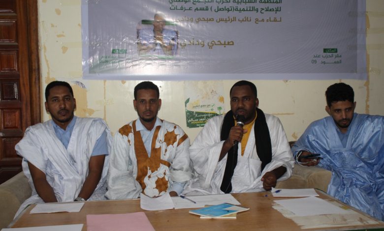 نظّم قسم المنظمة الشبابية للإصلاح والتنمية على مستوى مقاطعة عرفات بولاية نواكشوط الجنوبية، مساء الأحد 19 إبريل 2026، نشاطًا سياسيًا بمقر قسم حزب التجمع الوطني للإصلاح والتنمية (تواصل)، وسط حضور، وصف باللافت من المناضلين الشباب.